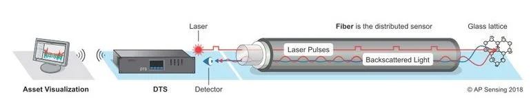 El sistema DTS utiliza elefecto Raman paramedir la temperatura. Unpulso láser óptico enviadoa través de la fibra provoca que parte de la luz se disperse y se refleje de vuelta hacia el extremo emisor, donde se analiza la información.